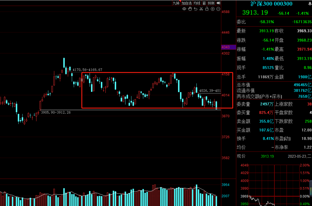 市场今天选择向下,沪深300跌破了这个箱体的下沿,理论上后面是会放大波动的。但从时间周期的角度上看,这里极有可能是4月中下旬以来调整的尾端,跌那么久要乐观。