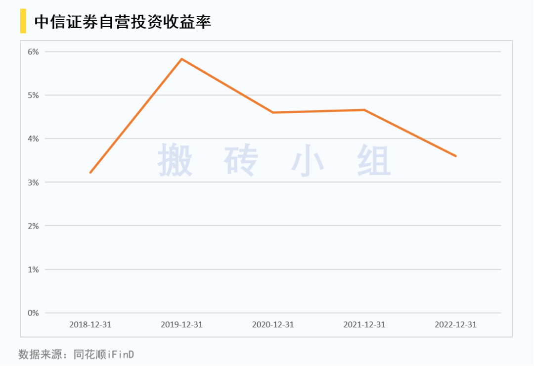 不过在2011年以后,中信自营的战略明显发生了调整,收益率从20%逐步向下走,即使是14-15年牛市,收益率抬升也不多。最近5年的自营收益率非常稳定,就在4%附近波动,明显感觉变成了一个“固收+”类型的走势了。