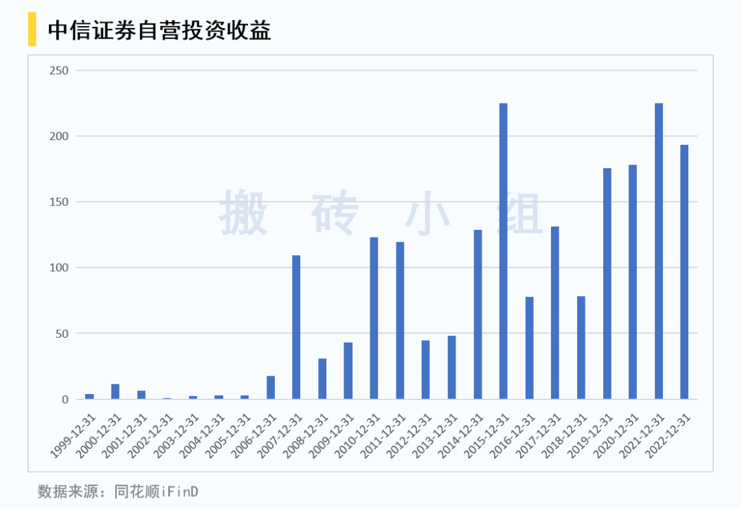 咱看问题得全面地看,有的自营确实是做的不行,但是大部分还是做的挺好的。我今天拉了下中信的数据,从1999年到现在,就没有一年亏钱的,不愧是券商一哥。
