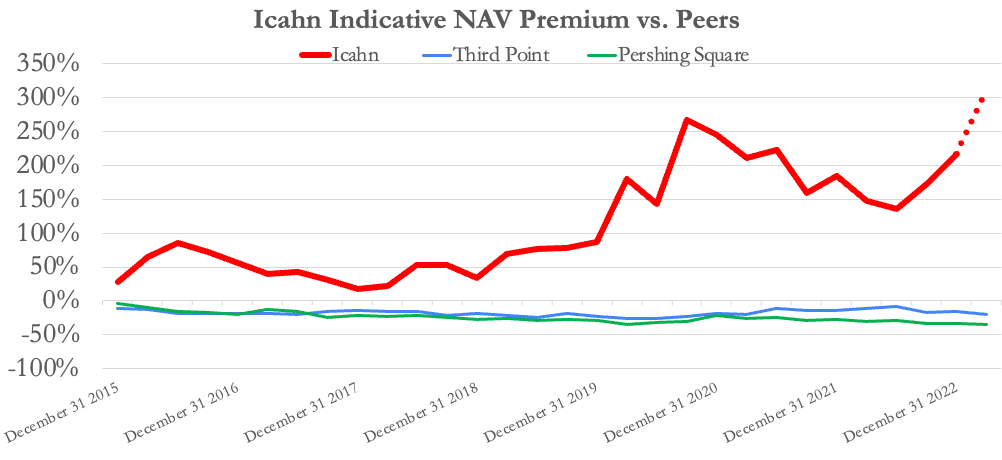 二是在暴跌前的溢价太高,这个条件为空头开枪提供了机会。在没有暴跌之前,IEP的价格是50美元左右,其净资产只有15.96美元,溢价高达218%。投资有一个常识,持有某个公司的股权资产市场一般是会给折价的。IEP的溢价是每个季度持续的高股息提供了支撑,但这并不符合常识。
