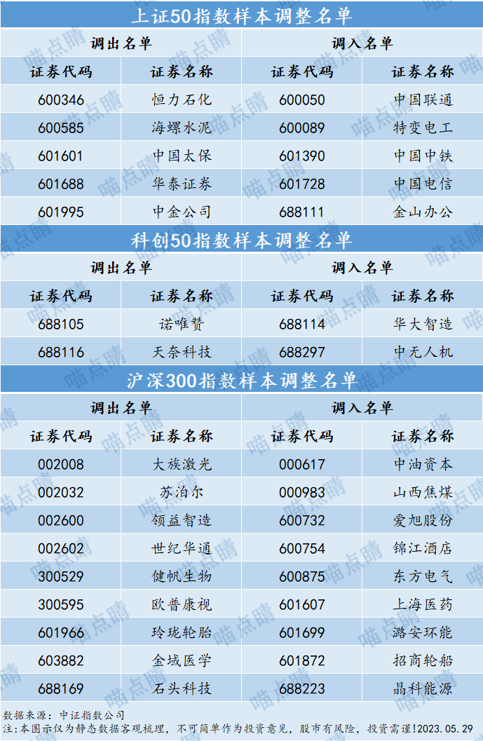 我整理了这次上证50、科创50、沪深300的成分股调整清单,另外受限于篇幅的影响,中证500的调整清单,我放在了后台,大伙在消息栏回复【成分调整】即可获取,也可以移步过去看看。