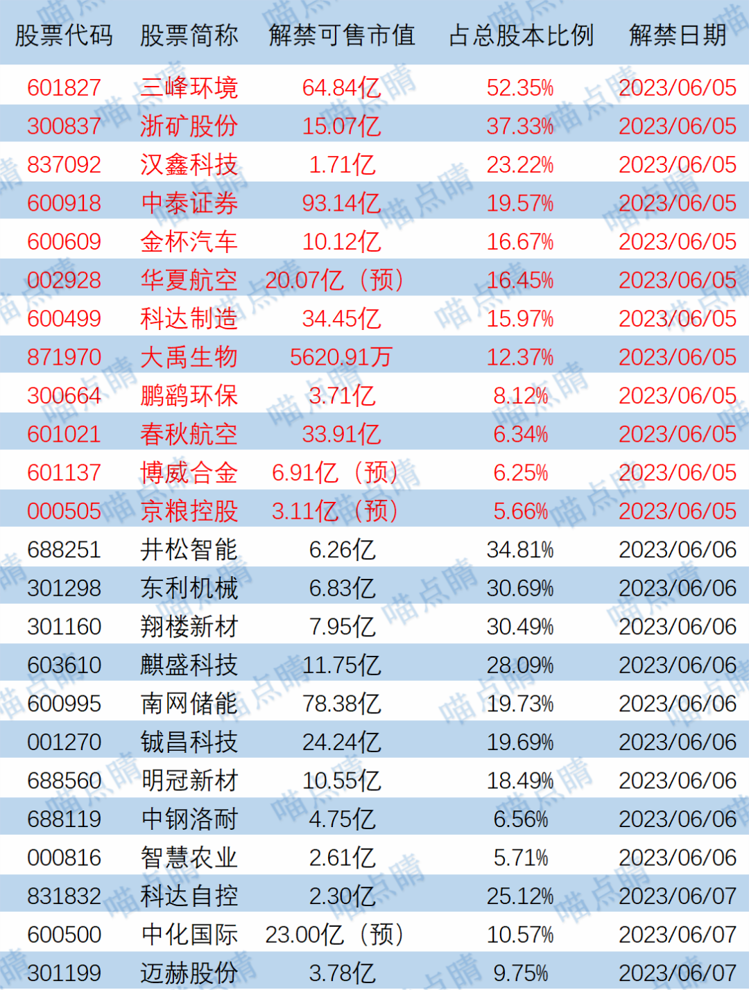 今天三峰环境、浙矿股份等有大额可售解禁。