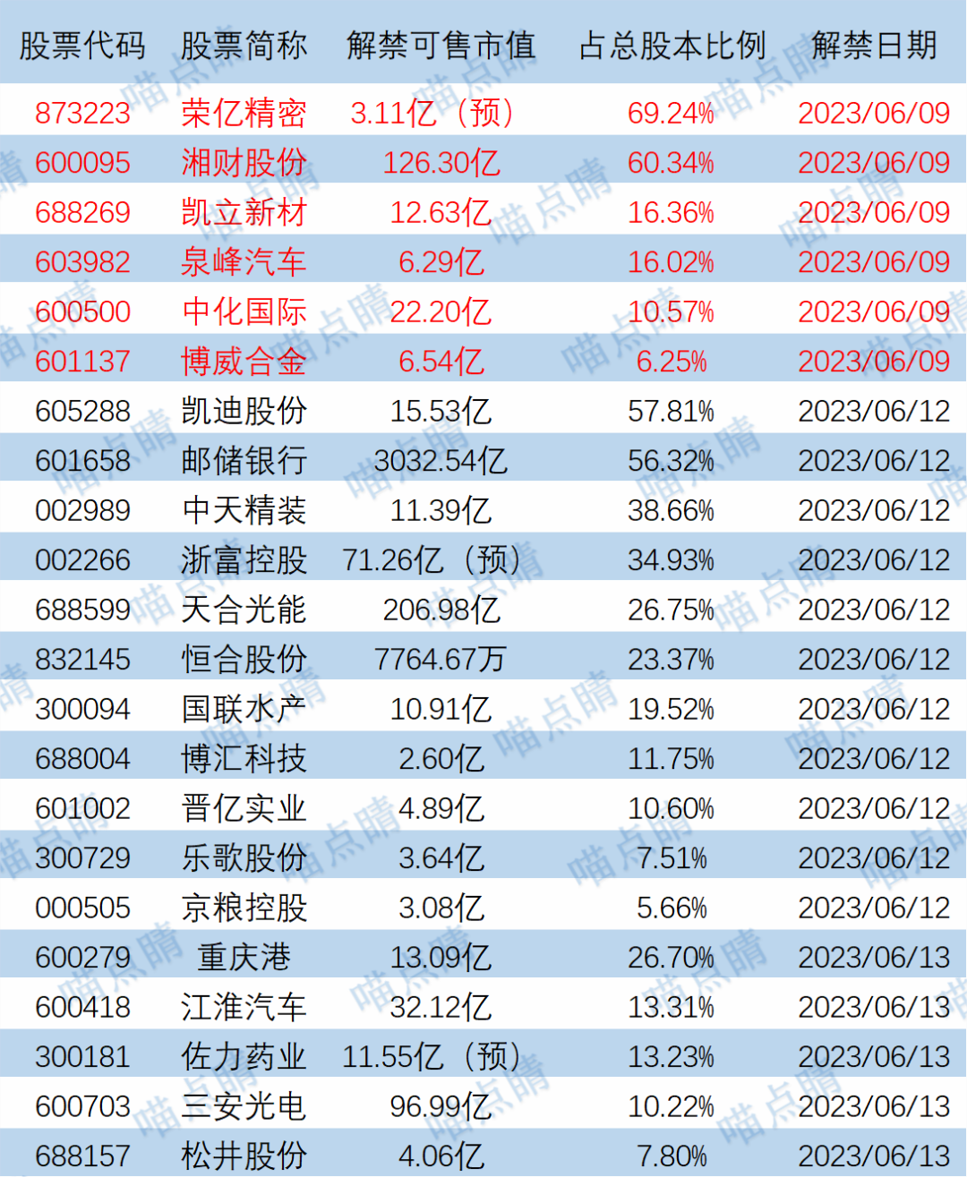 今天荣亿精密、湘财股份等有大额可售解禁。