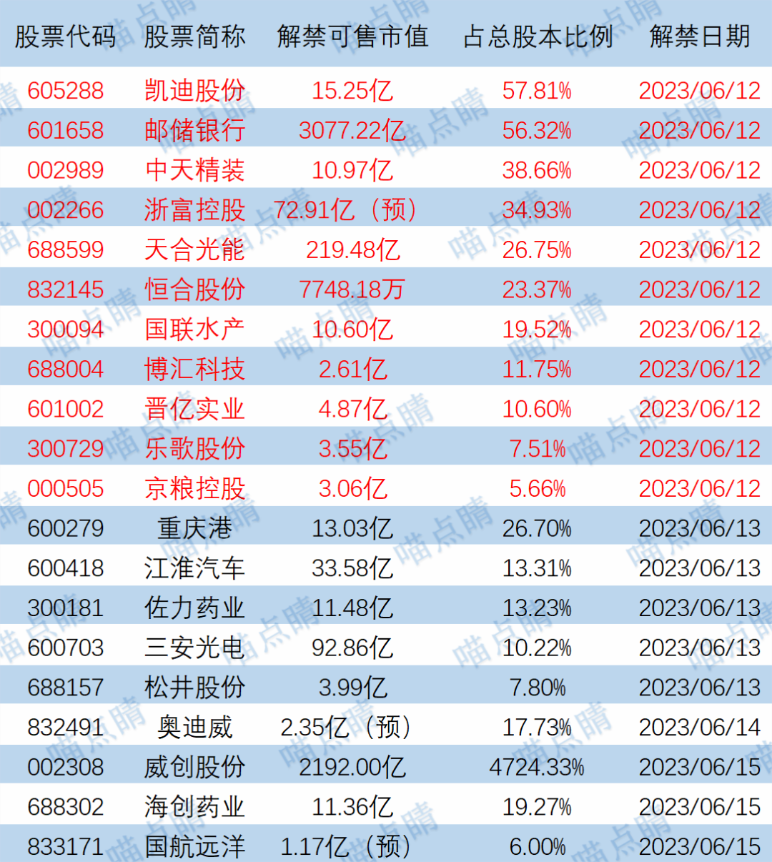 今天凯迪股份、邮储银行等有大额可售解禁。