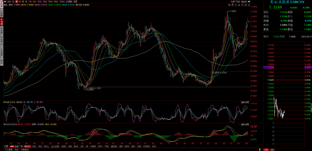 汇率是最近这两个月市场走弱的同步指标,这两天已经到了7.24,趋势走到这里是要注意的,因为从大级别上看,这已经接近极值附近了。
