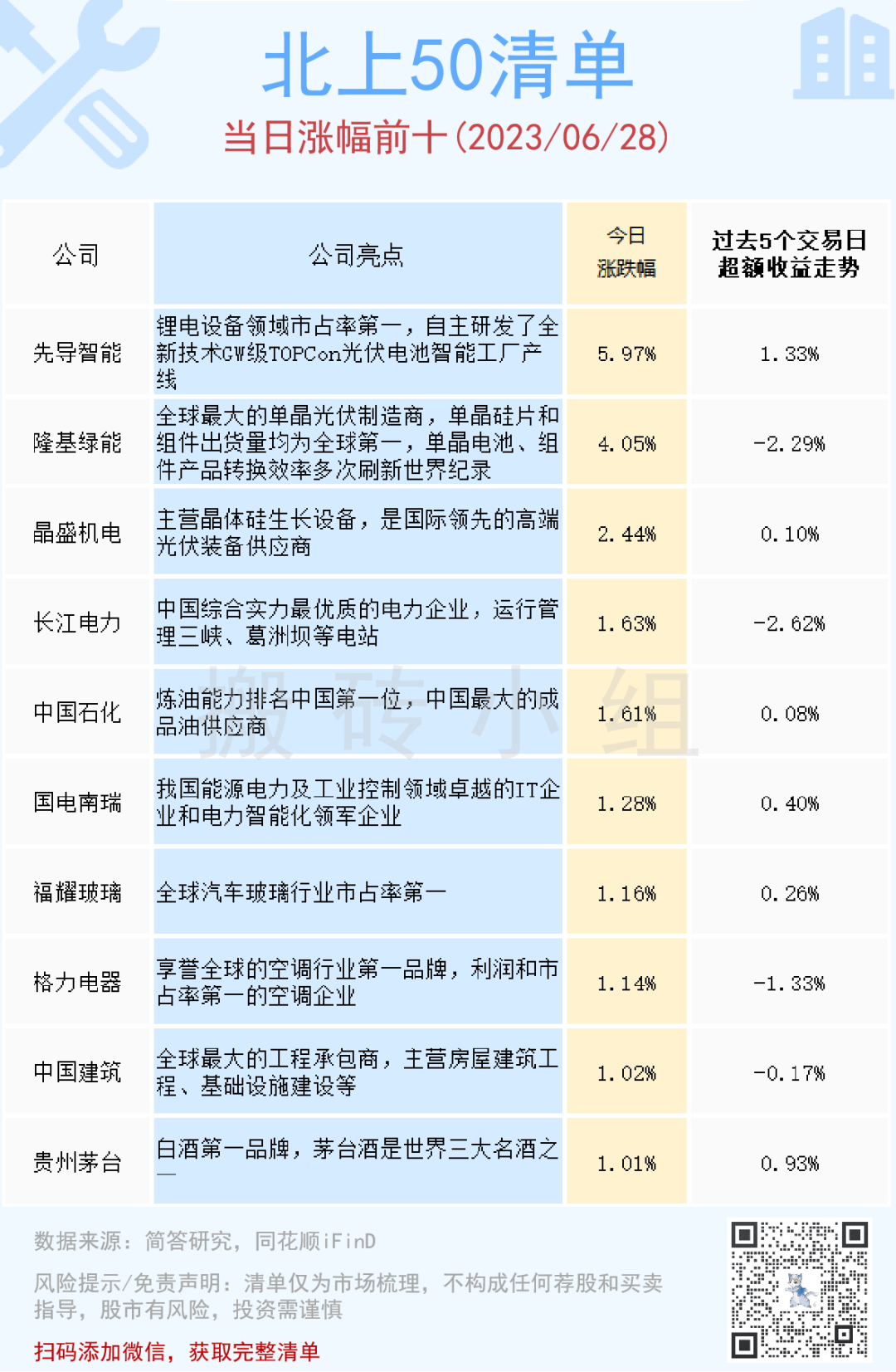 北上50榜单领涨的是新能源,趋势下跌的那段感觉已经差不多了,这里已经进入板块震荡筑底的阶段,有阿尔法和中报业绩的会先走出来。