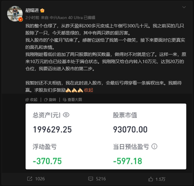 不过今天盘后他没有发微博再说现状了,如果到收盘也是亏钱,那就说明市场已经了解老胡这个新手,开始盯着他的自选了。。