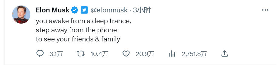 除此以外,马斯克还在劝大家要逐步远离手机,多和家人朋友聚聚。作为推特老板,说出这样的话,感觉还挺不协调的。。
