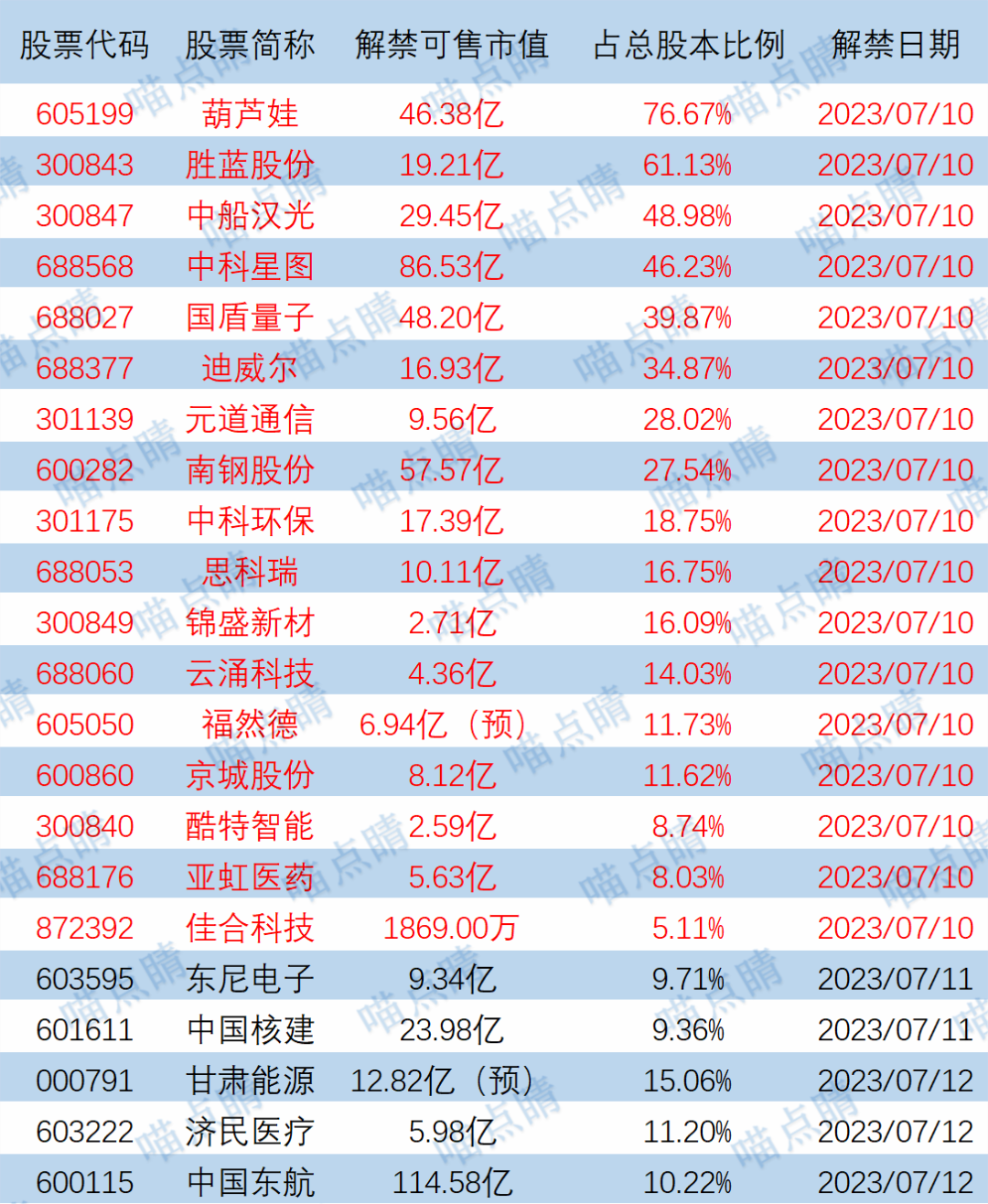 今天葫芦娃、胜蓝股份等有大额可售解禁。