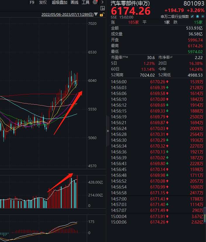 板块层面,我们之前关注的汽车今天继续保持强势,当下是市场头部方向是没有疑问的。这条线的逻辑已经讲过很多了,当下跟图走就好,看一眼汽车零部件的量价状态就有感觉,一图胜千言。