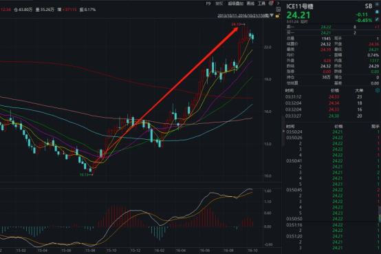 当时白糖期货反应也非常剧烈,从2015年8月到2016年9月,价格翻了一倍。