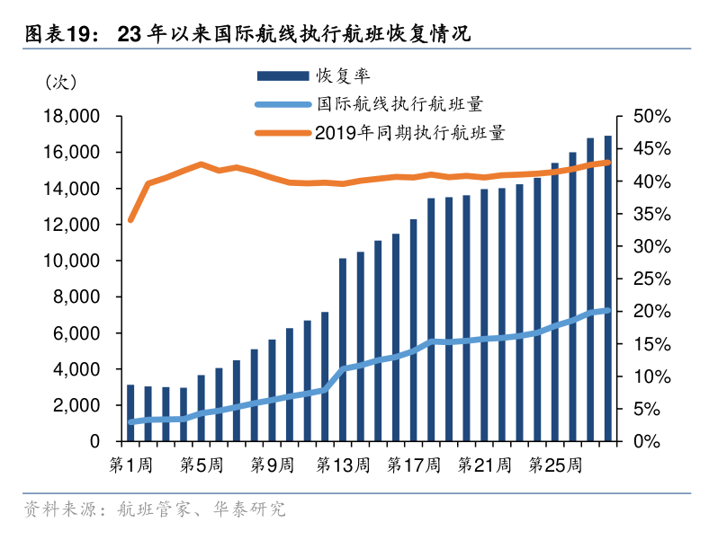 再看航空业这边,国内航班已经恢复得很好,国际航班今年一直在逐步恢复,当下已经恢复到2019年47%的水平。后续随着出境团的需求提升,国际航班的数量也会加速恢复。