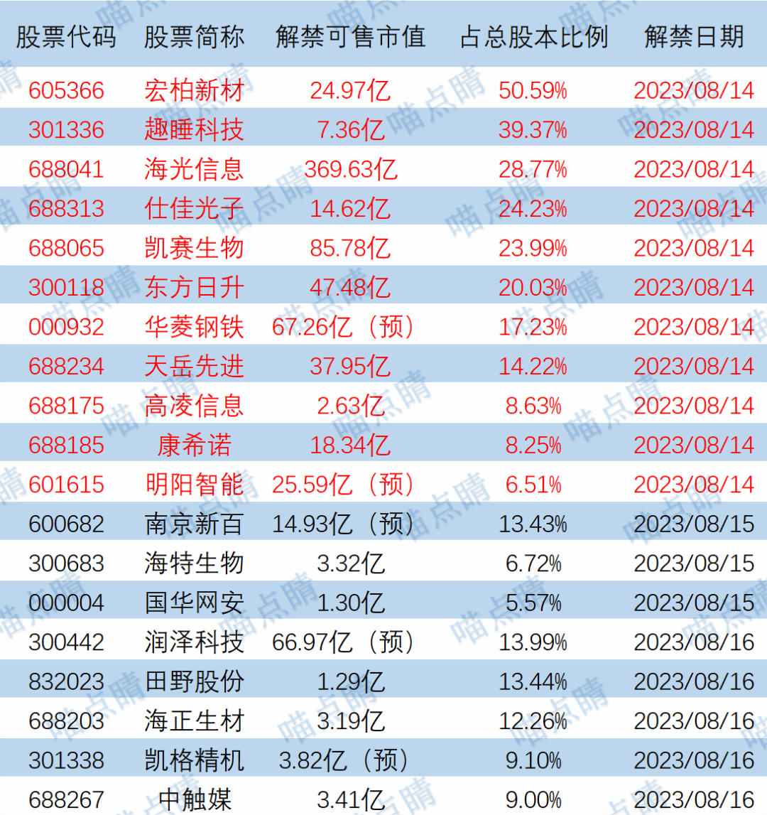 今天宏柏新材、趣睡科技等有大额可售解禁。