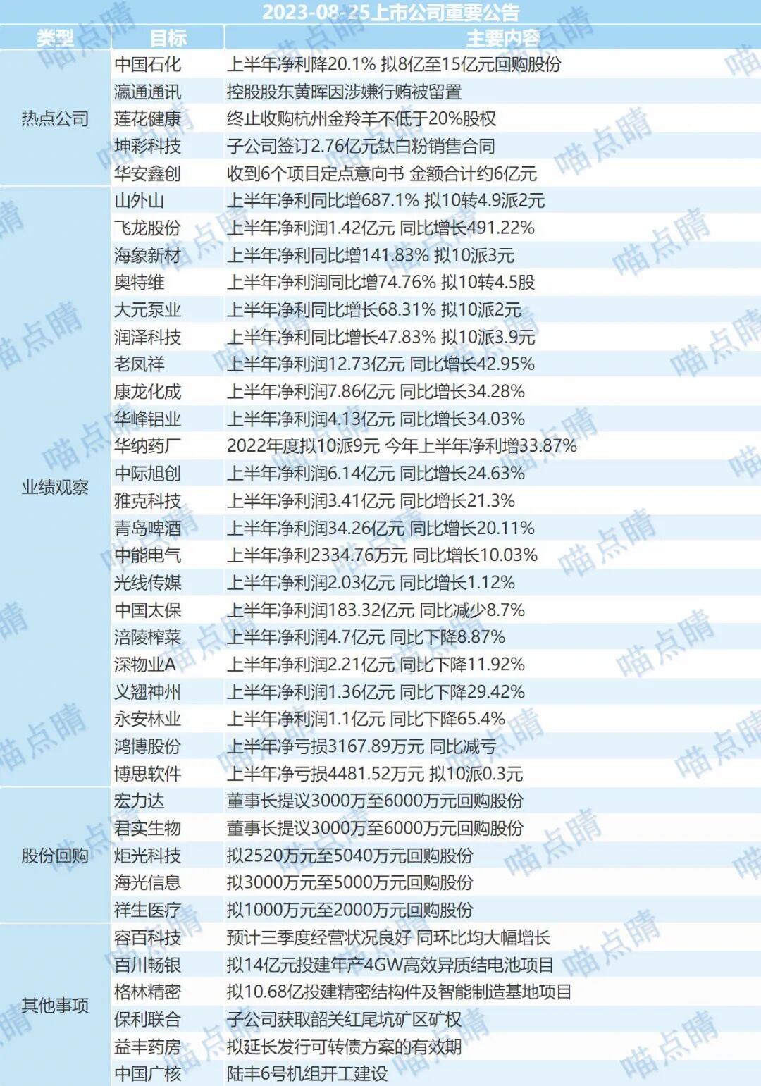 1、中国石化上半年净利润351.11亿元,同比-20.1%,今年化工不太景气,油价也跌了一些,这属于预期内的表现。不过公司表达了对下半年的信心,同时,宣布拟8亿元至15亿元回购股份,这操作还挺应景的。