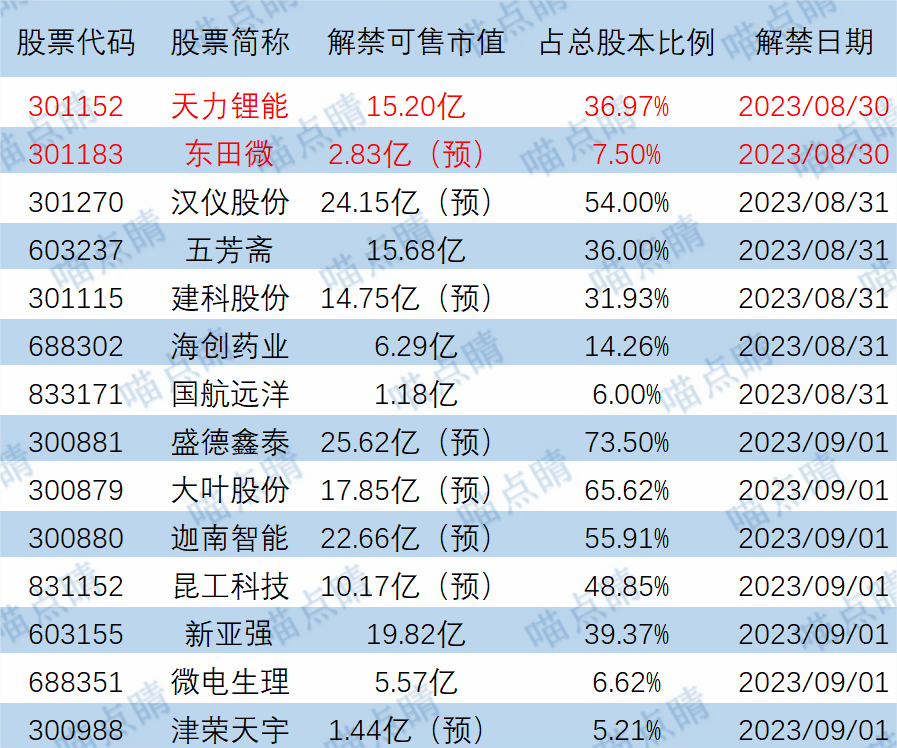 今天天力锂能、东田微等有大额可售解禁。