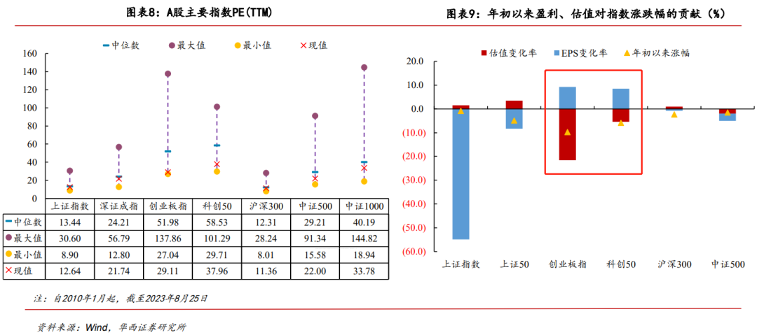 右侧部分就更有趣了,也是想重点聊的。这里统计的是年初以来指数涨跌的归因,可以看出双创板是年内跌幅最大的,而且其下跌全部是估值贡献的,业绩层面实际上还在趋好,而二者也是这些指数中唯二EPS在变好的。。