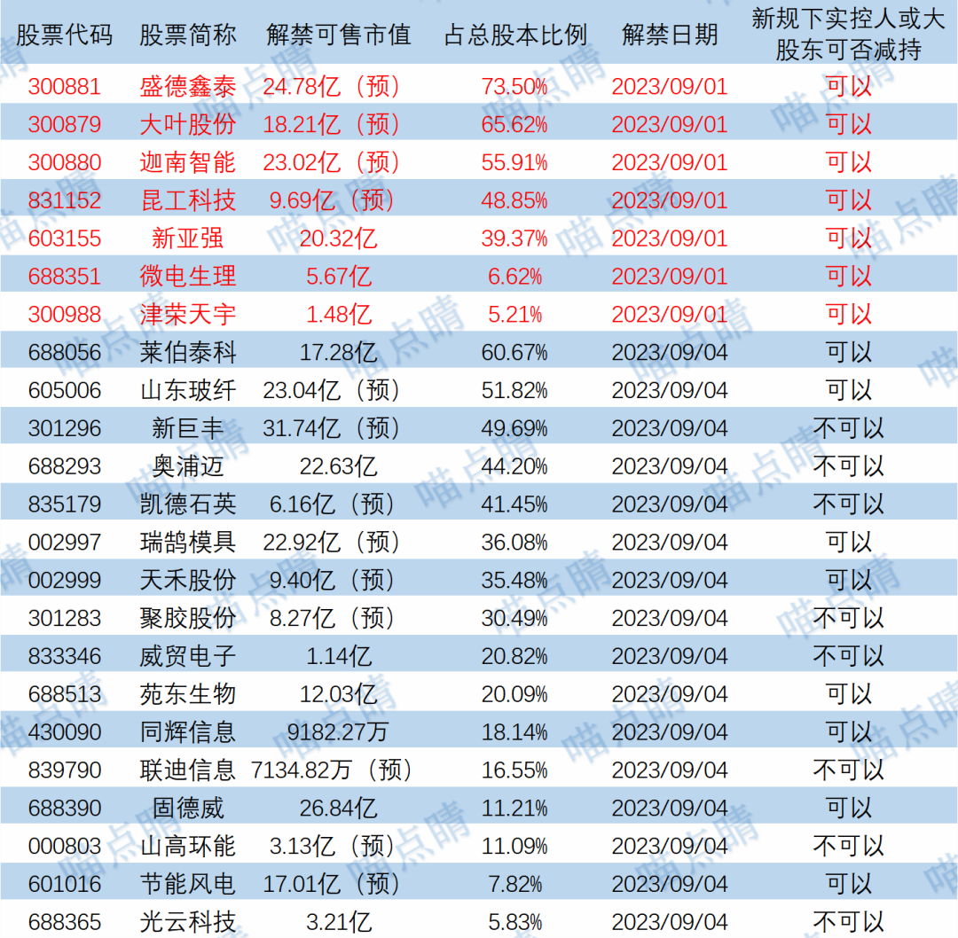 今天盛德鑫泰、大叶股份等有大额可售解禁。