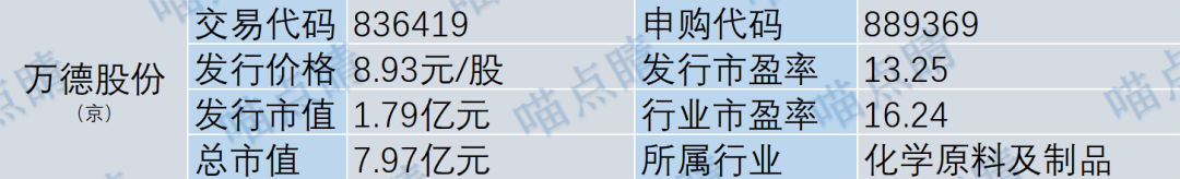 万德股份主营业务是油品添加剂、石油炼剂、油田化学品以及其他精细化工产品的研产销。公司是北交所的,中签需先缴款,中签收益率也比较低,大伙自行视情况考虑吧。