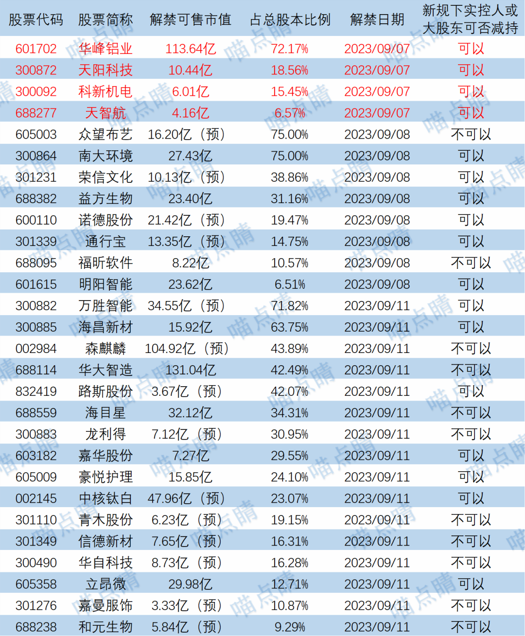 今天华峰铝业、天阳科技等有大额可售解禁。