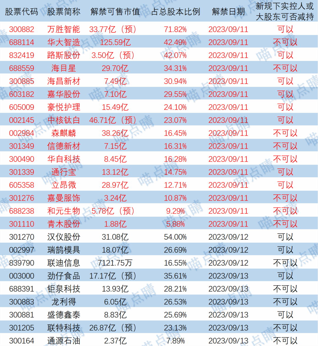 今天万胜智能、华大智造等有大额可售解禁。