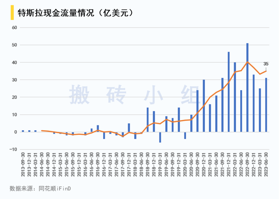 2020年年中特斯拉跨过了盈亏平衡线,往后财务状况大变,经营性净现金流持续为正,最近几个季度平滑下来,每个季度有35亿美元左右的现金流入。