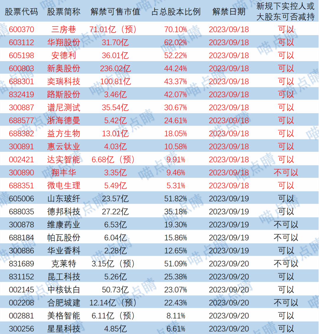 今天三房巷、华翔股份等有大额可售解禁。