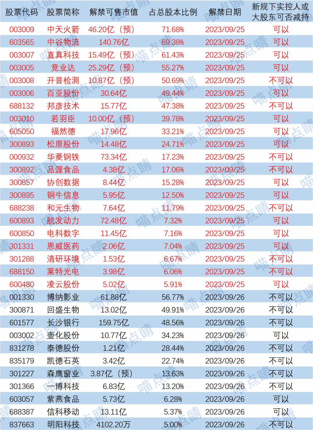 今天中天火箭、中谷物流等有大额可售解禁。