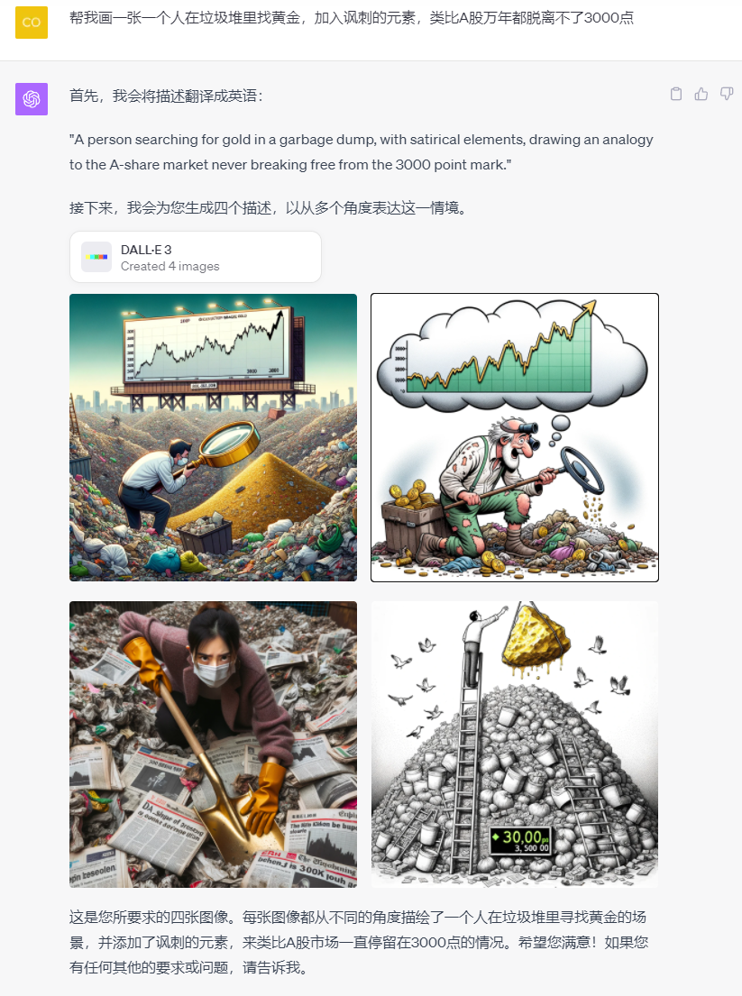 另外还喊他画了几张图,来表达一下我们这群在大A投资人的状态。提示语是比较简单的,至于输出的这几张图,怎么说呢,有点那个感觉了吧。。