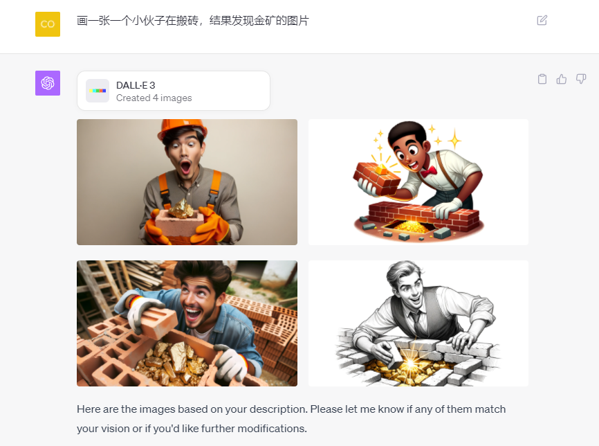 ChatGPT优秀的是在能够明白发现金矿会是惊喜的状态,所以输出的人物表情都能感受到很开心,这个是不会语义理解的文生图大模型做不到的。