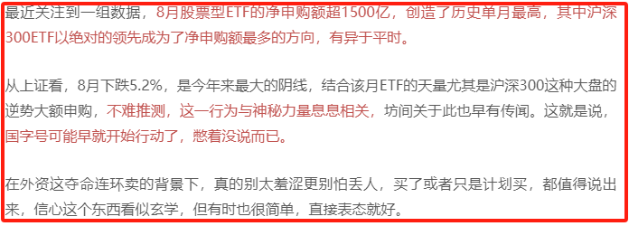 至于通过ETF买入的标的,当时看就是沪深300ETF,而昨天尾盘300ETF出现异动,从接近-2%直接拉到平盘,甚至干出了溢价,基本上证实了这一猜想。