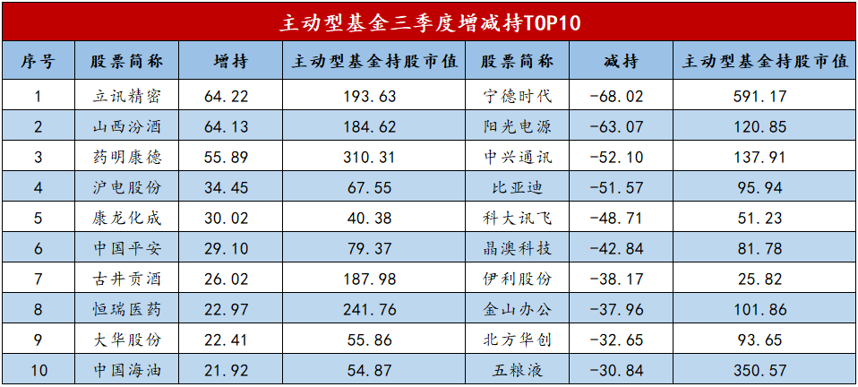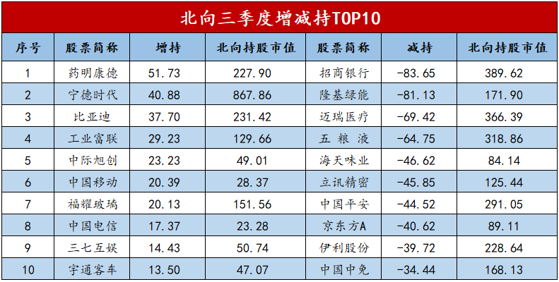 行业的增减持都是机构用真金白银做出的选择,整体的感觉是机构在兑现前面涨幅较多的板块,比如上半年涨幅较多的TMT方向,逆势布局相对低位的价值和赛道方向。下图是机构三季度增减持TOP10,从中也可以看到一些端倪。