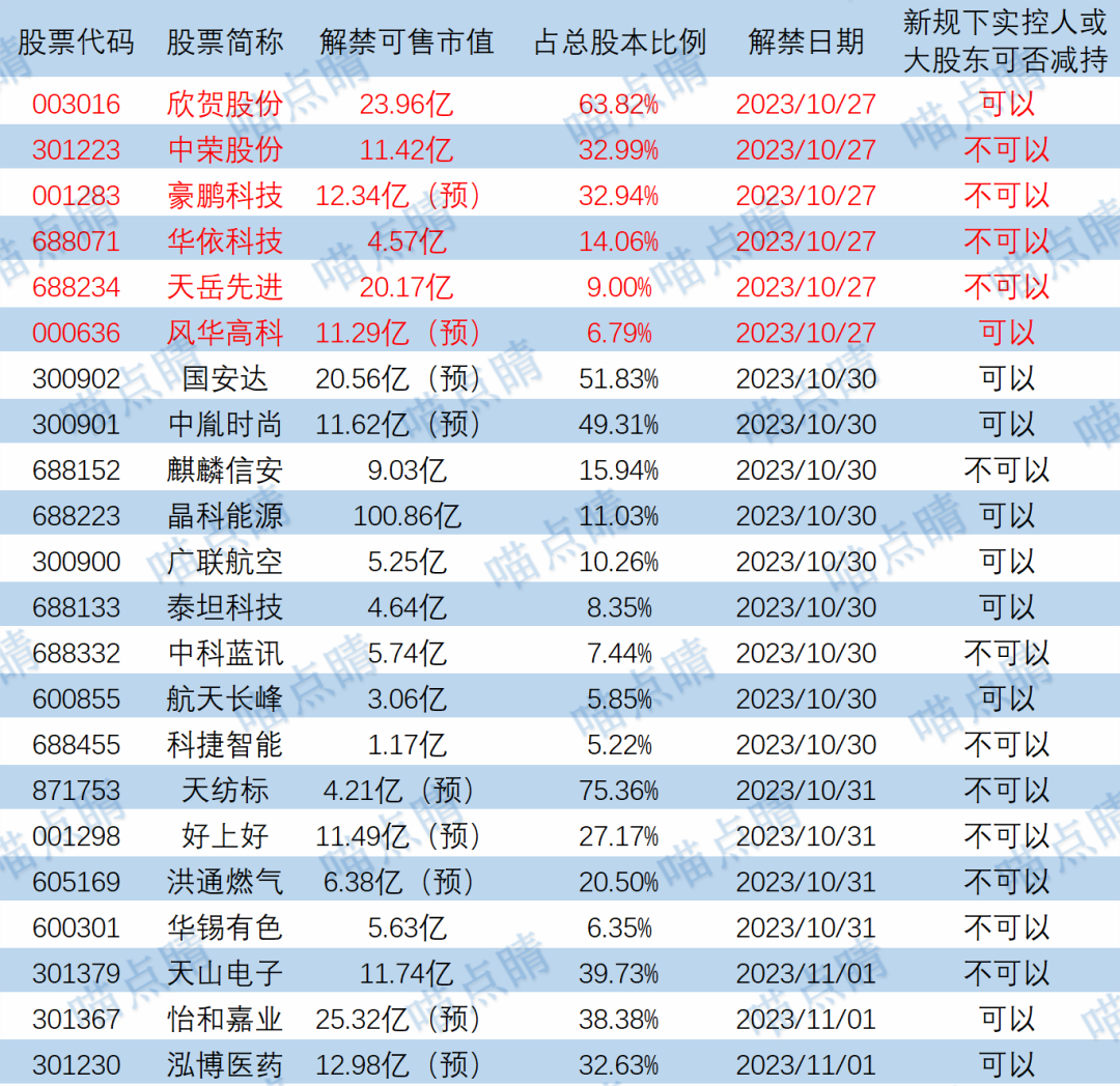 今天欣贺股份、中荣股份等有大额可售解禁。