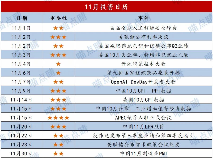 今天是11月第一天,我去看了下,这个月有非常多的大事,比如周四凌晨的美联储议息会议,再比如月中的APEC会议,以及减肥药、科技方向的产业事件,对资本市场都会比较大的影响,昨天我做了一份11月投资日历,大伙可以提前看看。