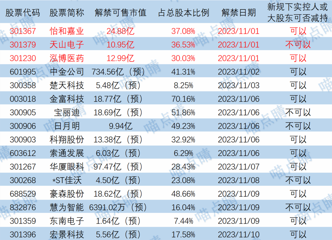 今天怡和嘉业、天山电子等有大额可售解禁。