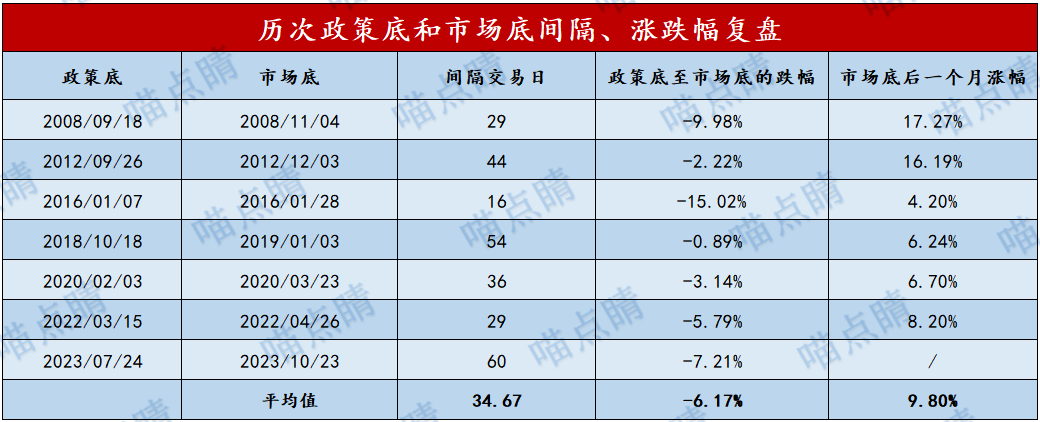 之前我们也做过一次政策底到市场底间隔时间和调整幅度的统计,昨天我简单做了更新,发现最近的底部2923点距离政策底已经过去了60个交易日,跌幅7.21%也已超过了平均值。。