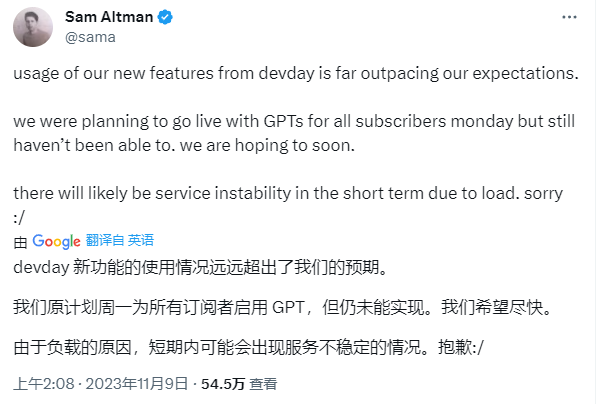 这回宕机的原因就是容量不够了,奥特曼在X上对此做了回应,大多网友都在猜是因为太多人用,所以算力支持跟不上。