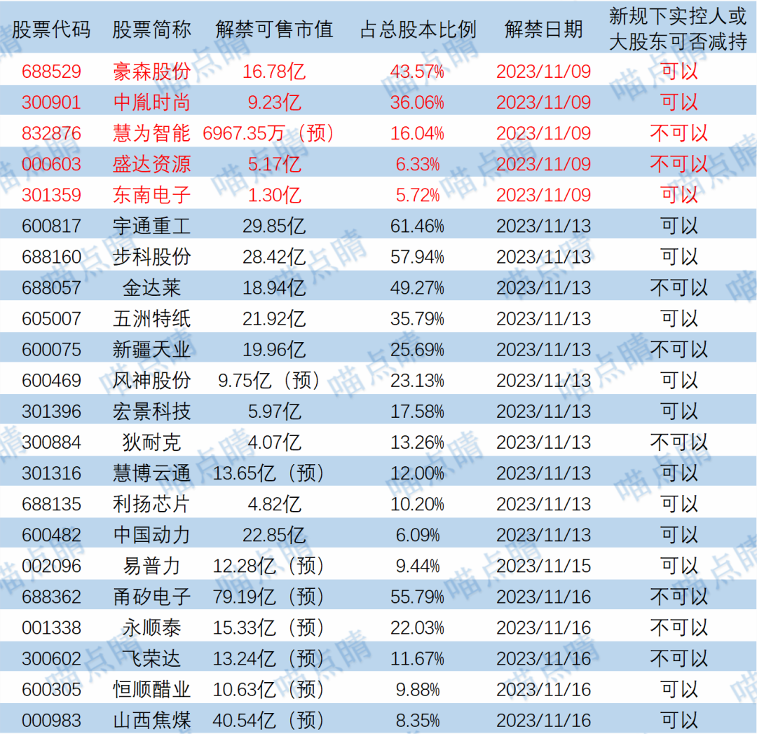 今天豪森股份、中胤时尚等有大额可售解禁。