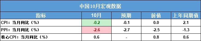 1、10月物价数据出炉,CPI同比-0.2%,PPI同比-2.6%。CPI在经历了短暂转正后再度负增,核心原因主要是食品价格的拖累以及需求偏弱的影响。