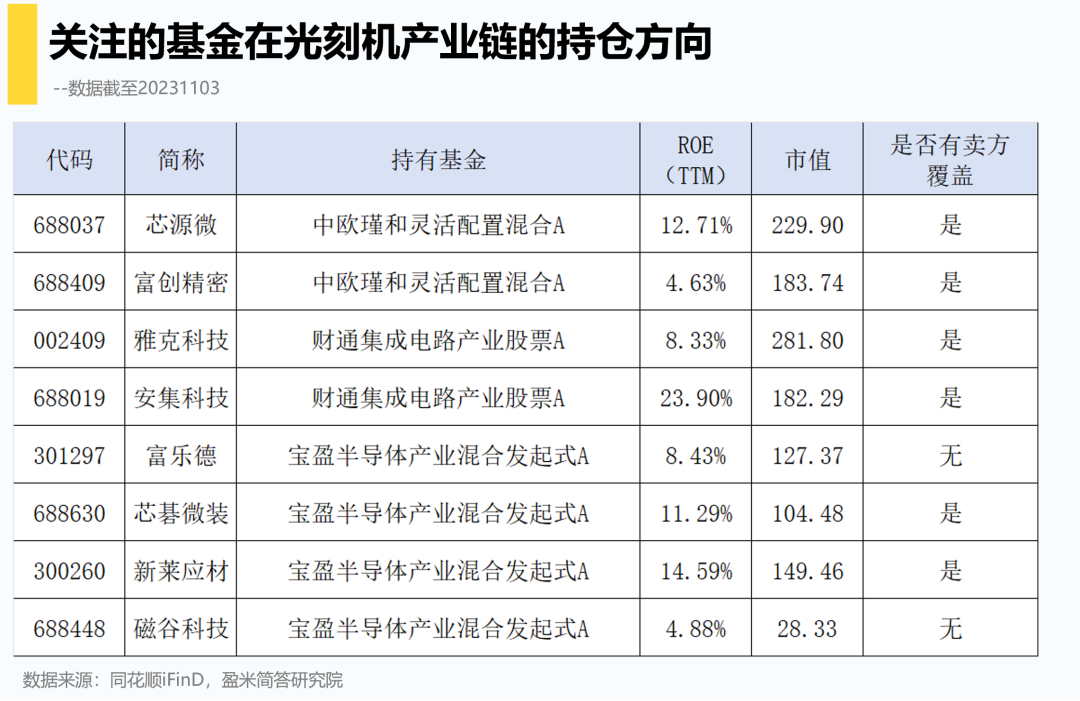 科技方向我们关注了几个公募基金经理,我把他们三季报的单子都拉出来看了看,跟光刻机有关系的公司都列在下面了。