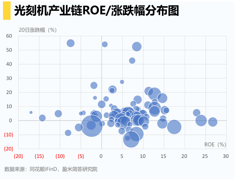 我们还把整个光刻机板块的单子都拉了出来,用ROE和过去20天涨跌幅做成了散点图,气泡的大小代表公司的市值大小。结果发现涨跌幅跟基本面没有任何关系,倒是小市值的超额收益比较明显。这跟现在市场的风格也是比较类似的,国证2000就比沪深300强非常多。
