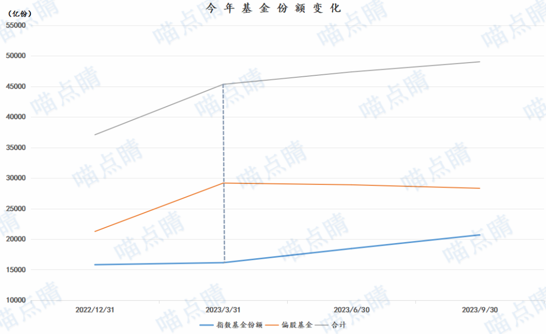我做了个统计,结果蛮有意思,今年都在讨论基金份额下滑的事情,但其实在偏股型份额下滑的同时,指数型基金反而是在走高的,这背后其实是顺势资金和逆势资金的区别与博弈,现在很多大资金都在通过ETF进行抄底。