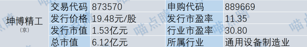 坤博精工主营业务是高端装备精密成型零部件、单晶硅生长真空炉体的研产销。公司是北交所的,中签需先缴款,中签收益率也比较低,大伙自行视情况考虑吧。