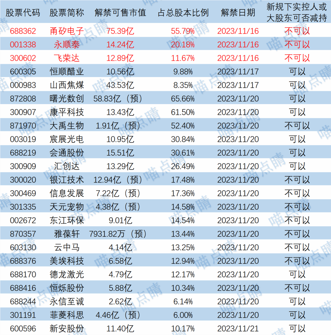 今天甬矽电子、永顺泰等有大额可售解禁。