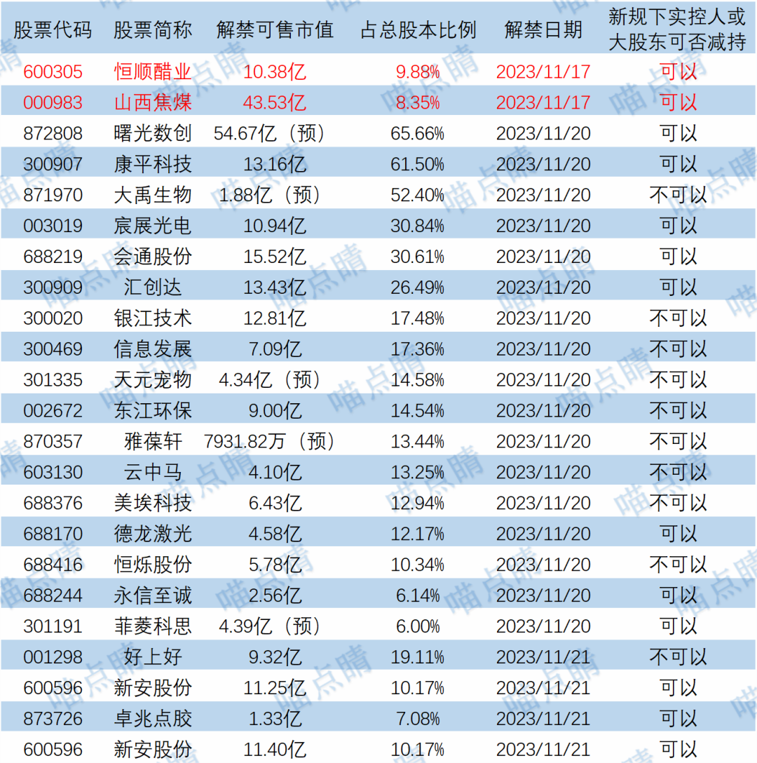 今天恒顺醋业、山西焦煤有大额可售解禁。