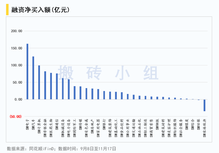 用申万一级行业的视角来观察,这一轮融资流入最多的是电子、汽车和计算机,这几个板块都是市场最近的大热方向,风偏比较高的融资盘买入也是符合逻辑的。