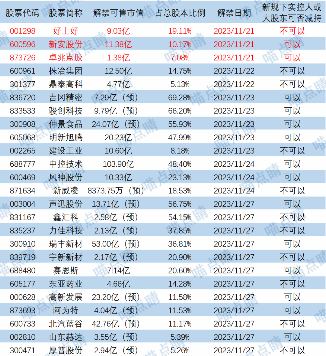 今天好上好、新安股份等有大额可售解禁。