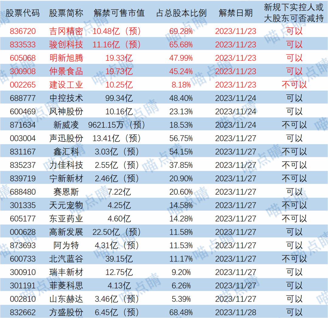 今天吉冈精密、骏创科技等有大额可售解禁。