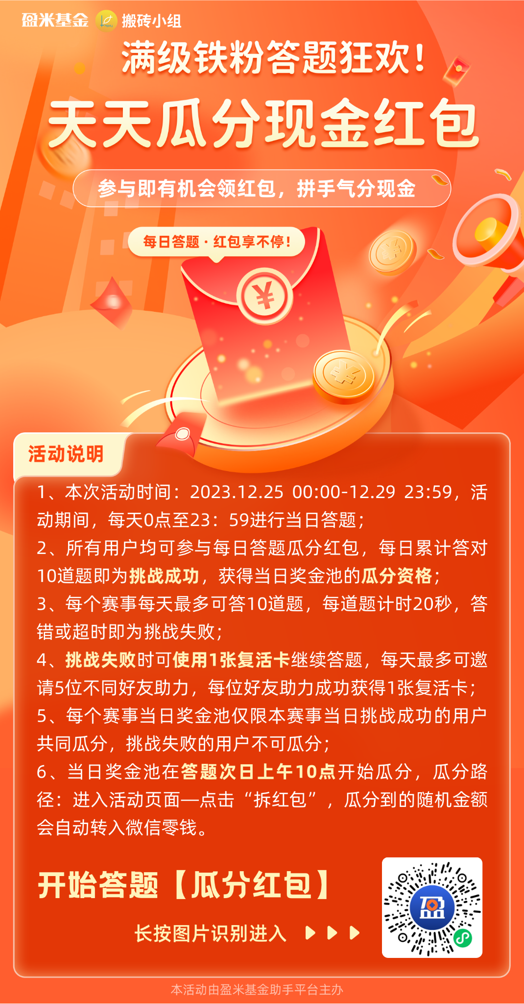 活动2.0雨露均沾,难度大幅下降,答对10道题目即可瓜分每天的现金红包。题目还是来自近一周的文章。具体规则参考下面海报,也可以立即扫描其中二维码,添加小程序,然后周一就可以开始答题了。