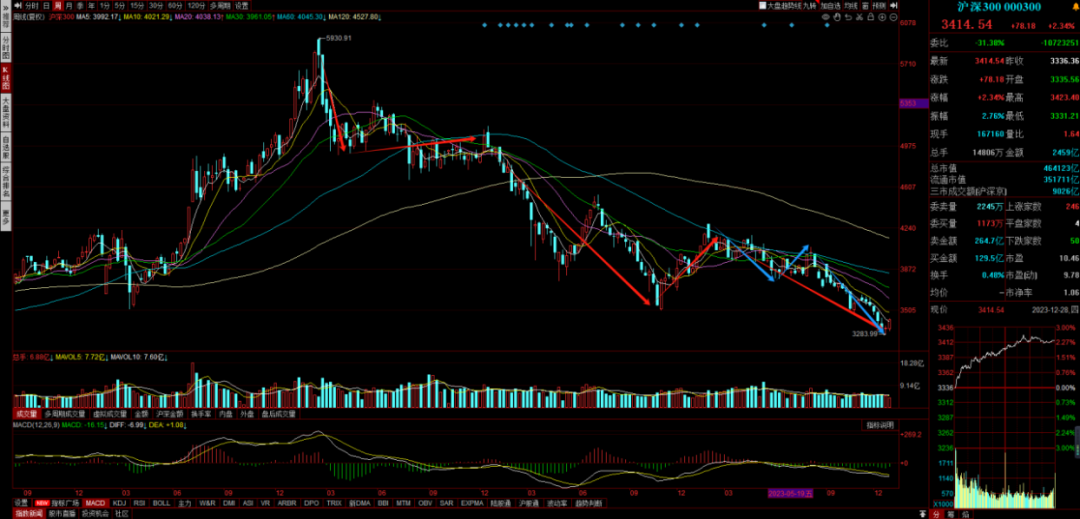 沪深300为例,从2021年初至今的调整,当下有可能是5-4的反弹开始,周线级别一笔的反弹时间会比较长,时间周期上看可能会到春节前了。