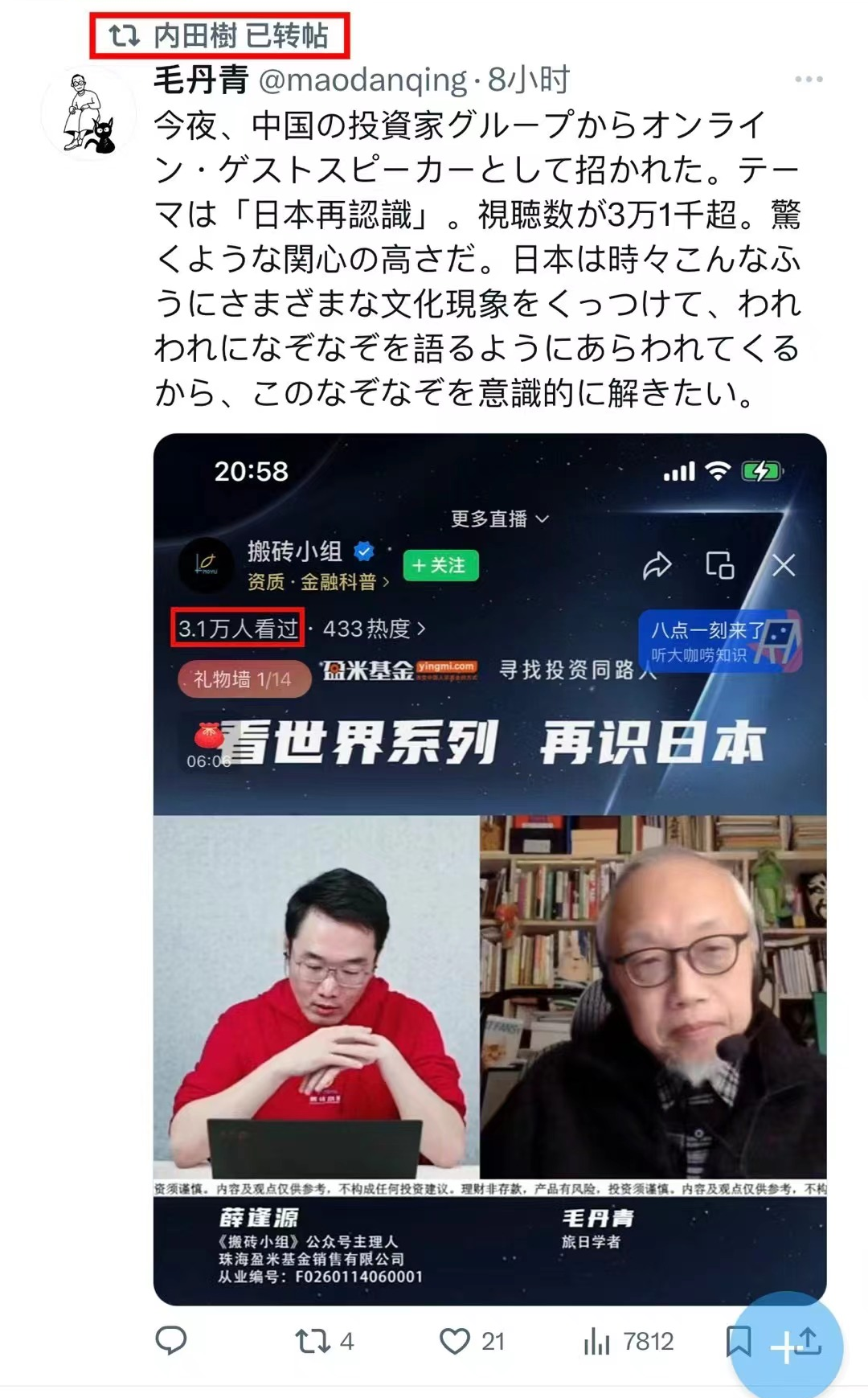 另外昨天发了关于跟毛老师交流思考的文章后,也有不少人来聊这个视频的内容。昨晚上咱还知道了个事,线上访谈之后,毛老师在日推上写了感想,内田树教授转发了这个推特,并且邀请毛老师也在他的读者群里聊聊。